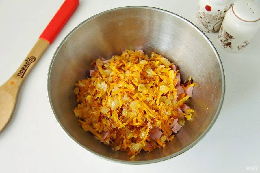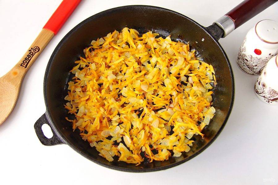 Лук нарежьте кубиками. Морковь натрите на крупной терке. Обжарьте овощи до готовности на сковороде.