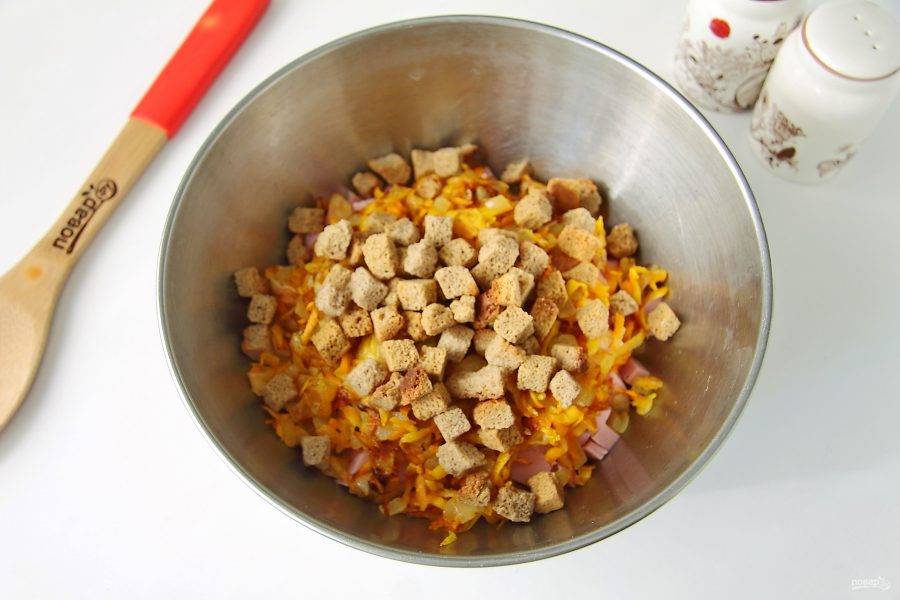 Перед самой подачей салата добавьте сухарики. Если не оказалось сухариков под рукой, то просто нарежьте хлеб кубиками и подсушите на сковороде.