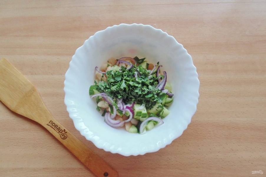 Салат с фасолью и огурцами готов. Подавайте на закуску или в качестве гарнира к птице, мясу, рыбе.