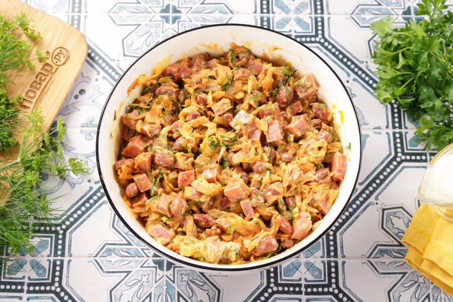 Салат с фасолью, морковью и колбасой готов. Подавать можно сразу же.
