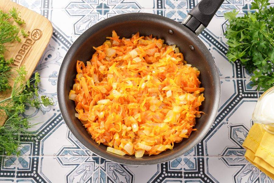 Лук нарежьте кубиками, а морковь натрите на крупной тёрке.