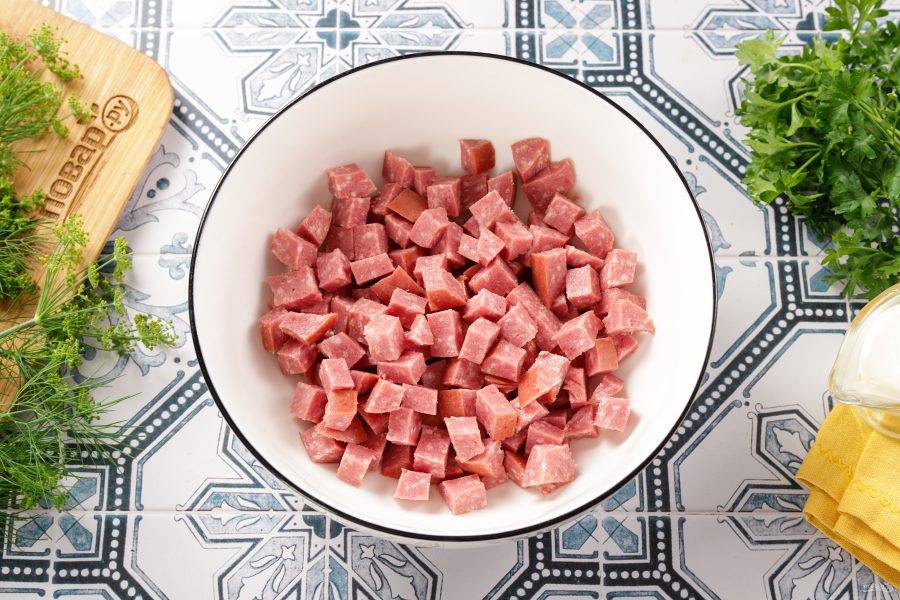 Колбасу нарежьте кубиками и переложите в глубокую миску или сразу в салатник.