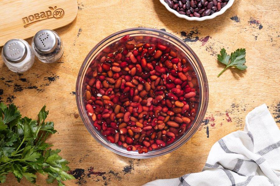 Фасоль предварительно замочите в воде на 8-10 часов. Можно оставить на ночь.