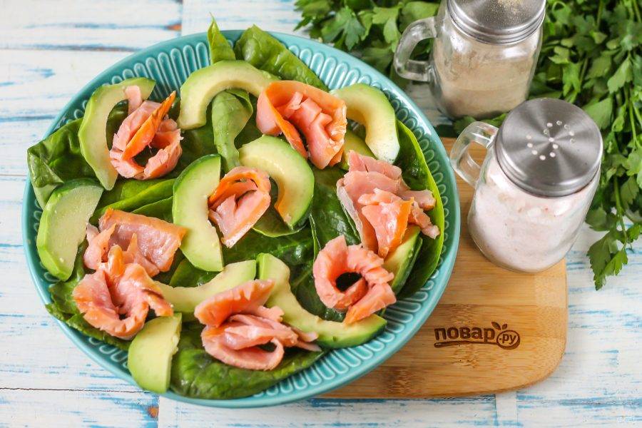 Вскройте упаковку со слабосоленой горбушей, выложите ломтики рыбы между нарезкой авокадо.