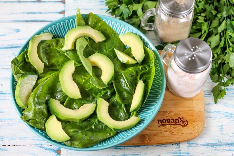 Авокадо очистите от кожуры, разрезав пополам и удалив косточку. Затем нарежьте каждую половинку слайсами и выложите на шпинат.