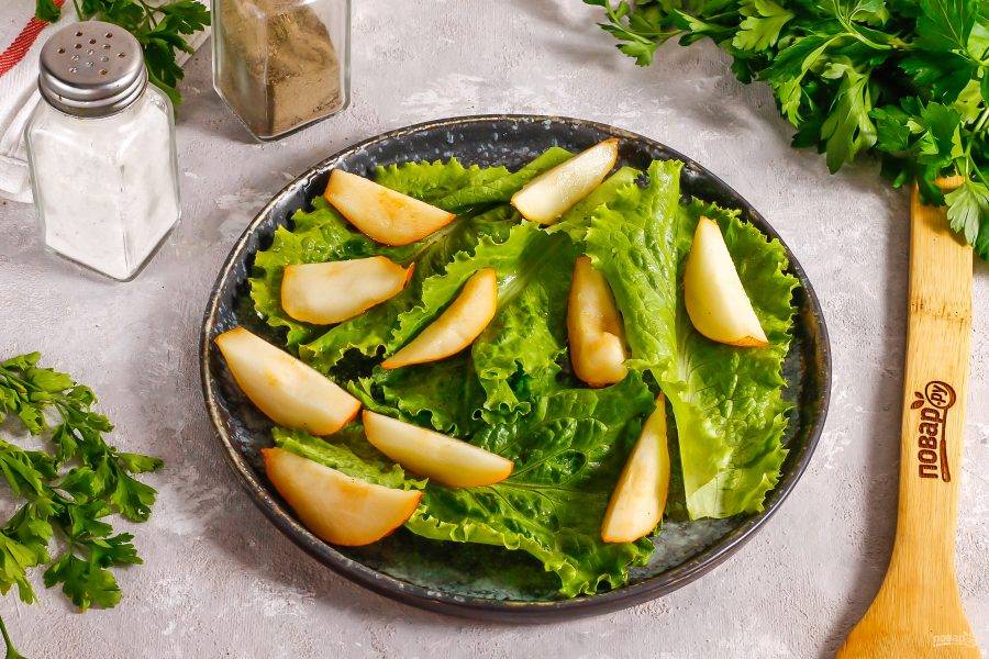 Груши разрежьте на четыре половинки и срежьте семена. Промойте мякоть и нарежьте ломтиками. Выложите на листья салата.