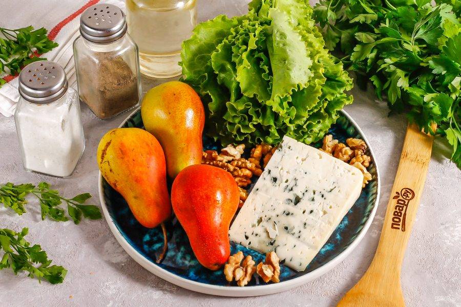 Подготовьте указанные ингредиенты. Сыр приобретите в супермаркете. Груши и листовой салат промойте в воде.