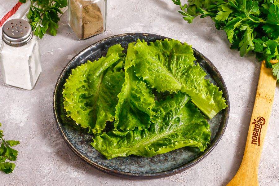 Срежьте окончания стеблей салата и стряхните с него лишнюю влагу. Выложите листья на тарелку. Можно вместо него использовать свежий шпинат или другой вид салата, но не слишком пряный.