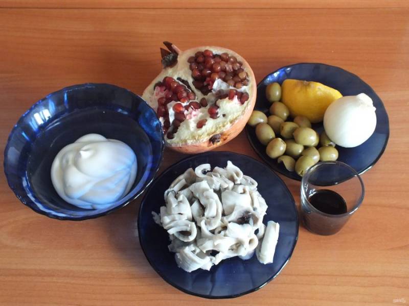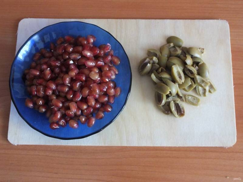 Подготовьте зёрна граната. Разрежьте оливки на 4 части.