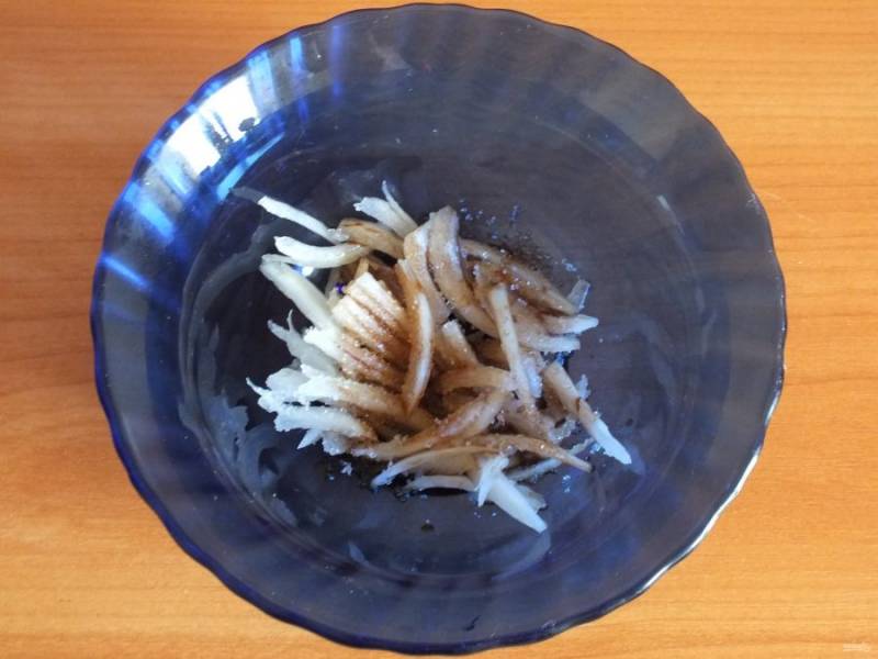 Лук нарежьте перьями и замаринуйте с сахаром и бальзамическим уксусом. Это займет 10-15 минут.