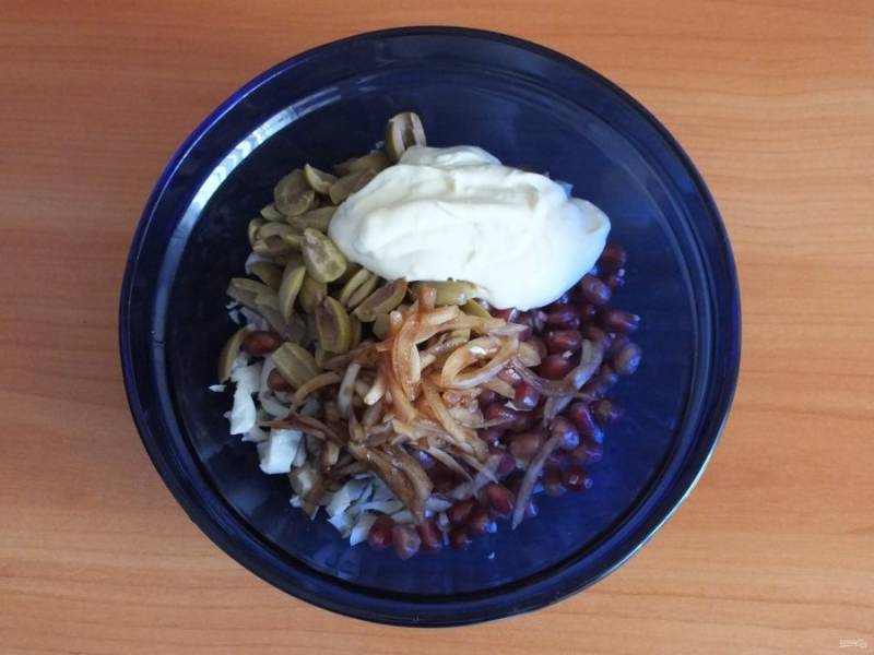 Соедините в салатнике все ингредиенты. Заправьте майонезом, перемешайте и охладите.