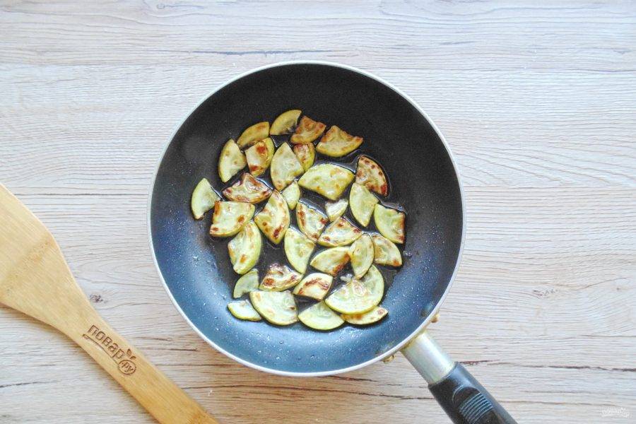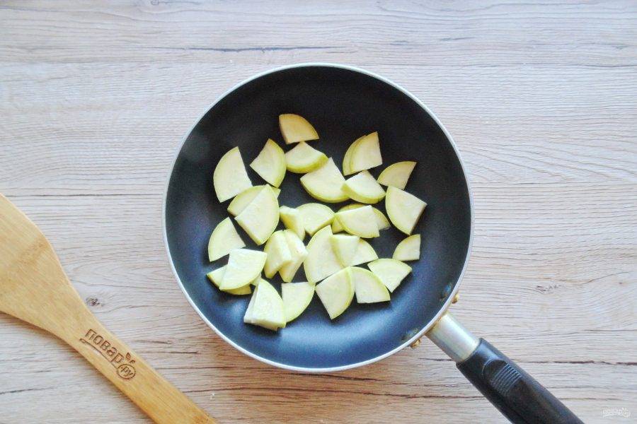 Кабачок помойте и нарежьте. Выложите в сковороду.