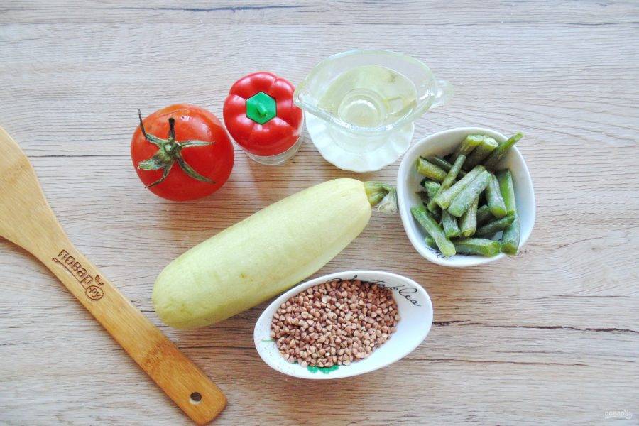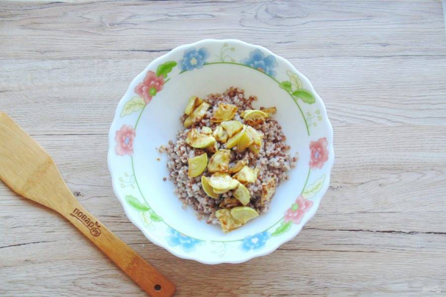 В салатник выложите отварную гречку, добавьте жареный кабачок.