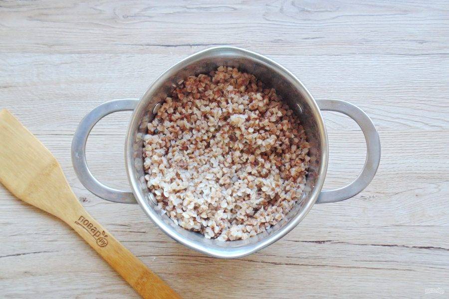 Гречневую крупу помойте и выложите в кастрюлю. Залейте водой, посолите по вкусу. Соотношение гречки к воде 1:2.
