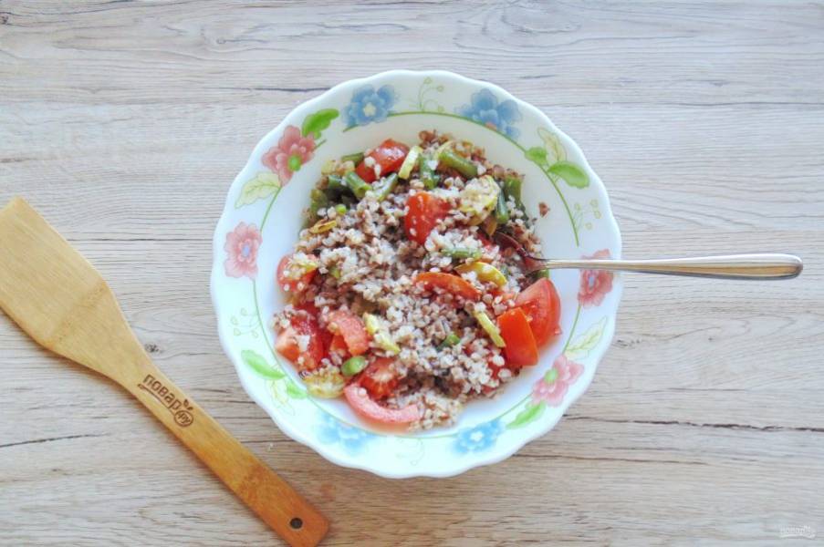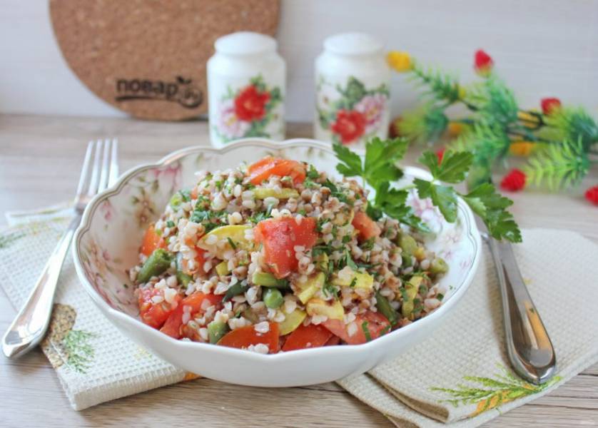 Салат с гречкой и овощами готов. Подавайте на закуску.