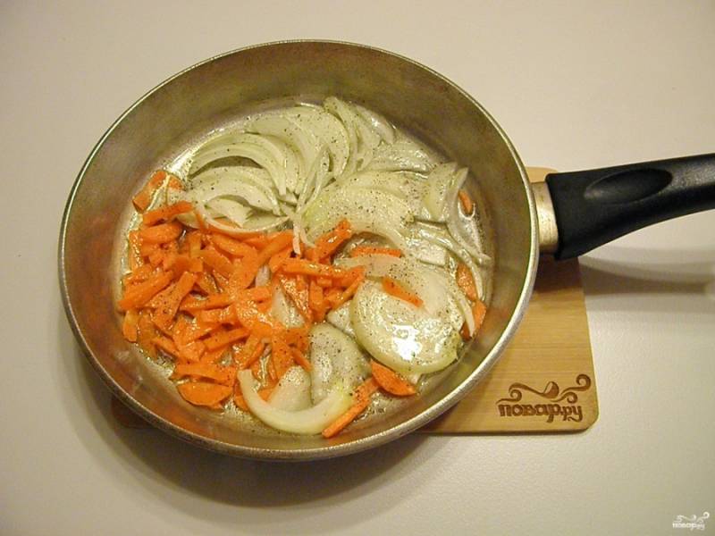 На растительном масле обжарьте лук и морковь. Посолите, поперчите по вкусу.