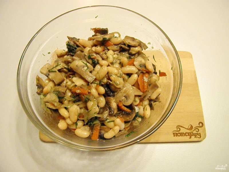 Возьмите глубокий салатник, сложите туда фасоль, грибы, лук, морковь, укроп. Полейте жиром от жаренья овощей, откорректируйте на соль.