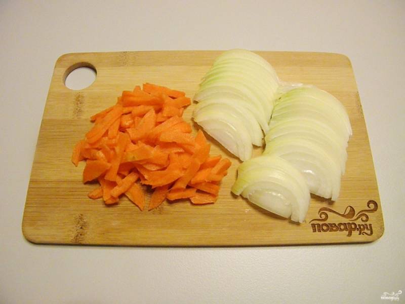 Очистите лук и морковь, порежьте их тонко.