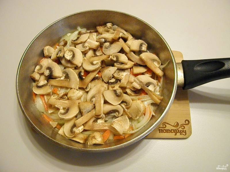 К полуобжаренным луку и моркови добавьте грибы и жарьте до готовности всех продуктов.
