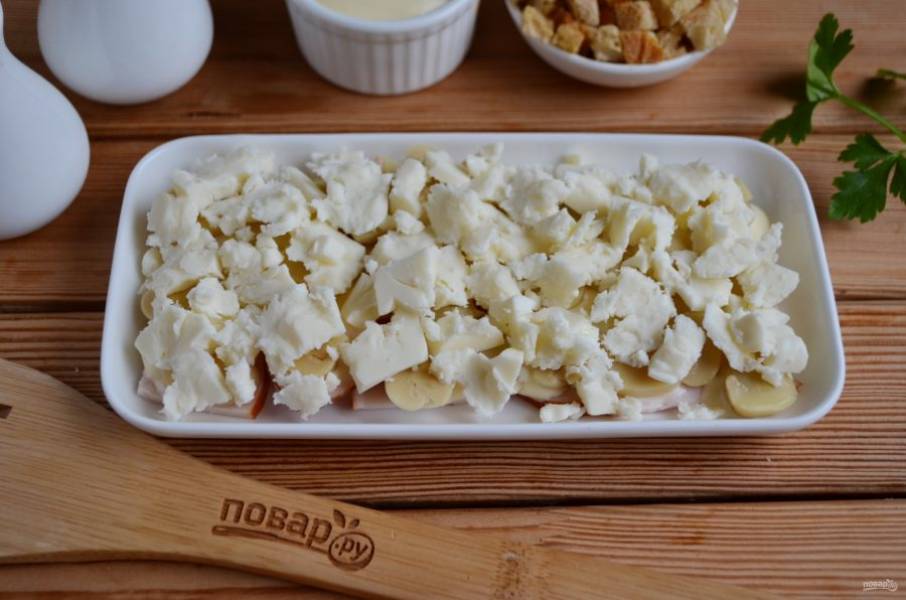 Отрывайте руками кусочки плавленого сыра и раскладывайте следующим слоем.