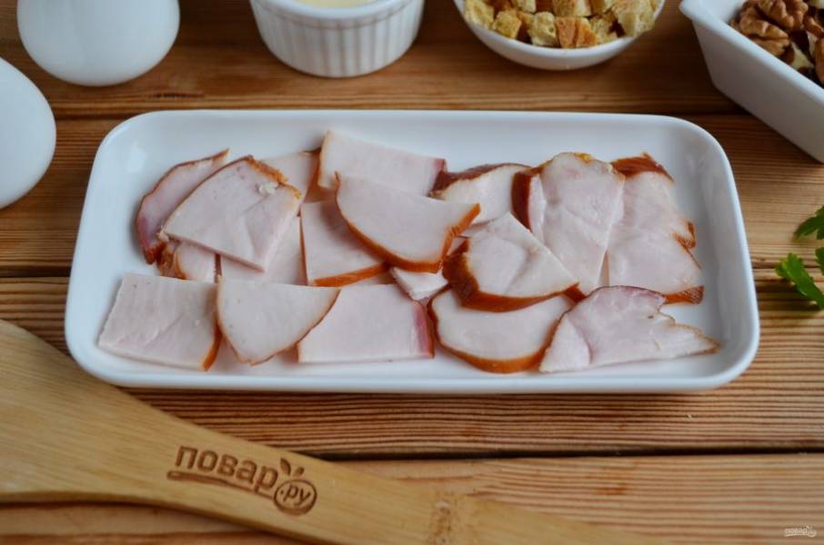 На дно салатника уложите порезанную пластинками копченую курицу.