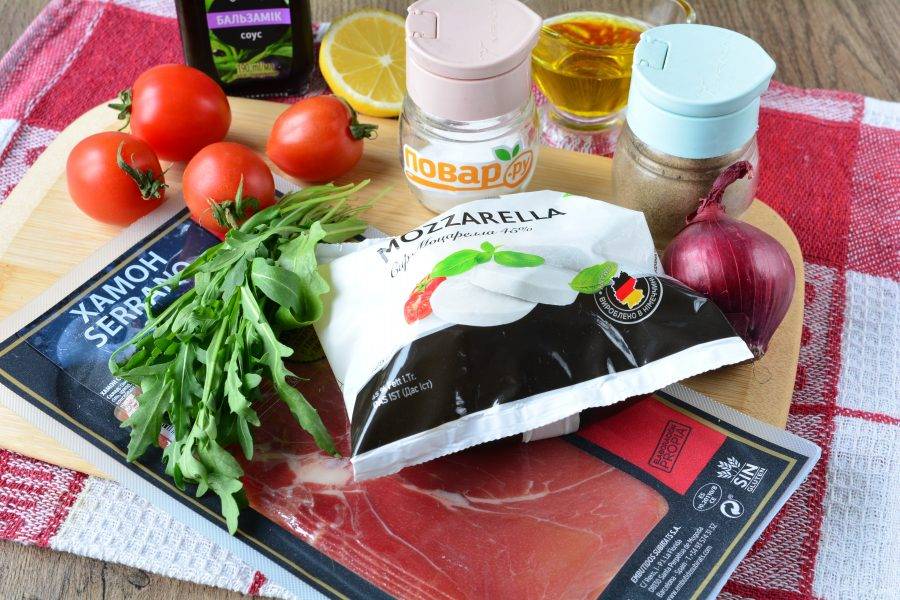 Выложите в глубокую миску промытую и высушенную на салфетках рукколу, добавьте все овощи и хамон. Полейте бальзамическим соусом, оливковым маслом и лимонным соком. Перемешайте, добавьте по вкусу соль и черный перец. Готово!