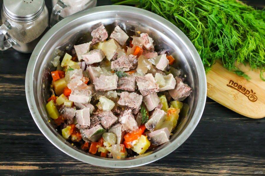 Аккуратно нарежьте холодец, оставшийся с праздника, добавьте его в емкость.