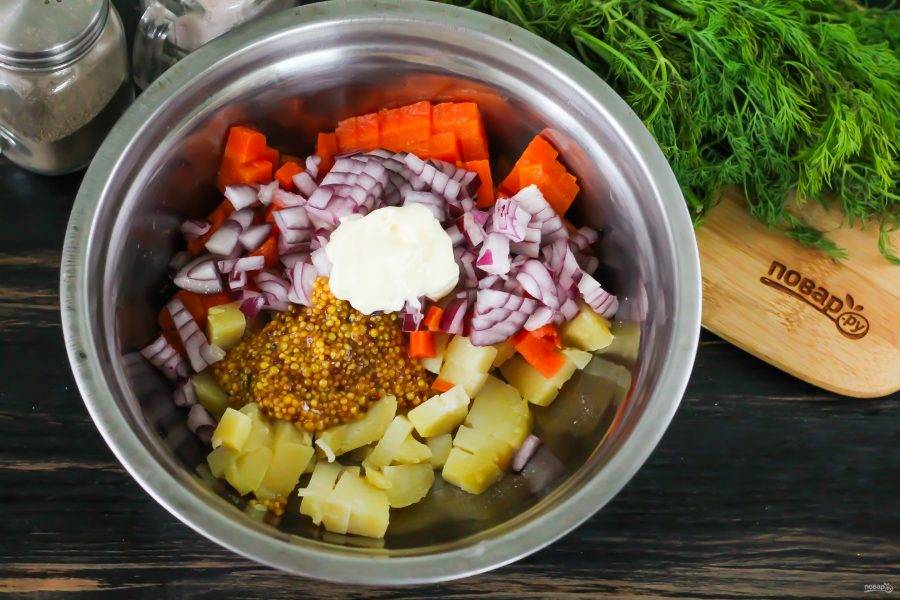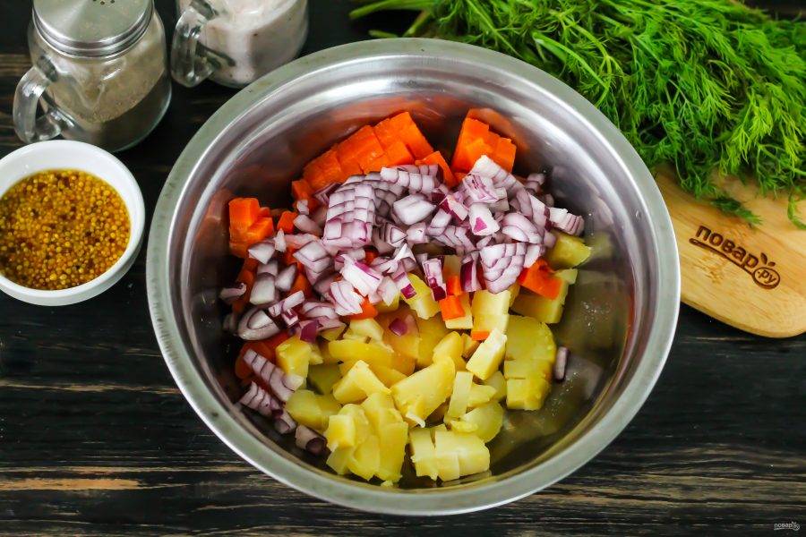 Отварные морковь и картофель нарежьте мелкими кубиками, высыпьте обе нарезки в салатник или глубокую миску. Очистите от шелухи красный лук, промойте его в воде и нарежьте таким же образом, добавьте к овощным нарезкам.