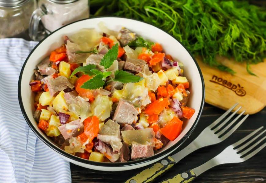 Перемешайте салат легкими движениями и украсьте по своему вкусу, сразу же подайте к столу либо охладите в холодильнике, чтобы холодец не растаял.