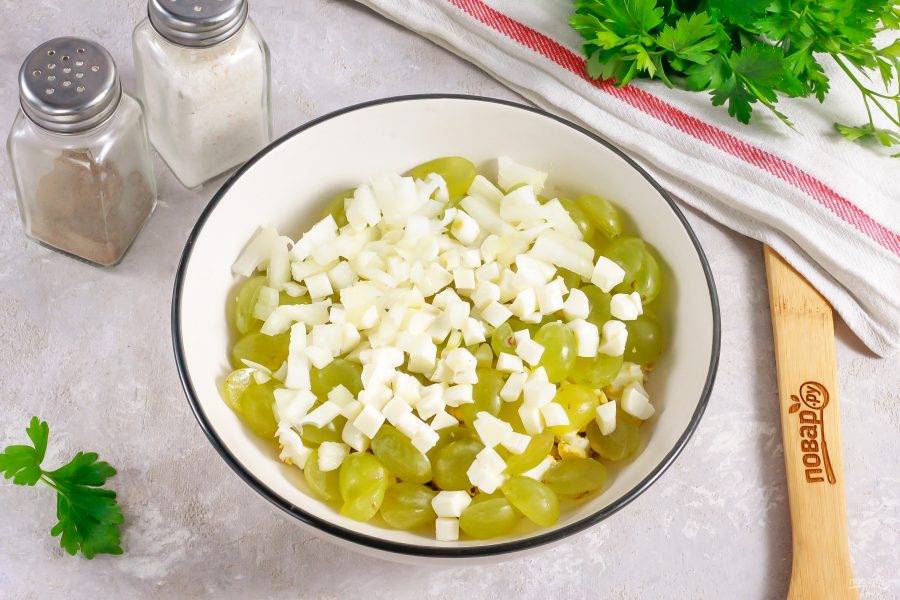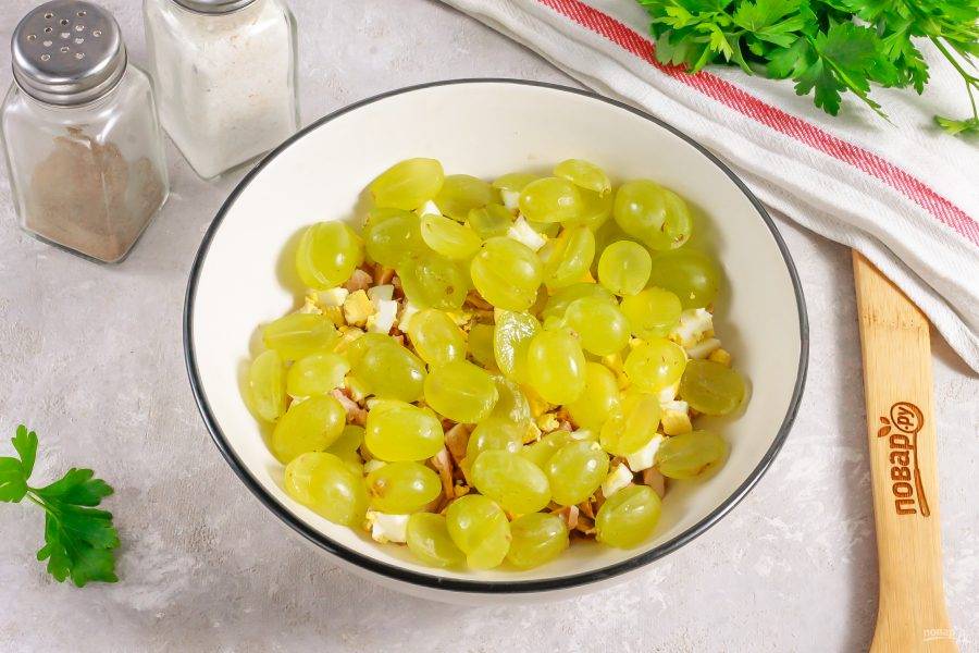 Виноград промойте в воде, отделите ягоды от стебельков и разрежьте пополам. Добавьте нарезку к другим в емкость.