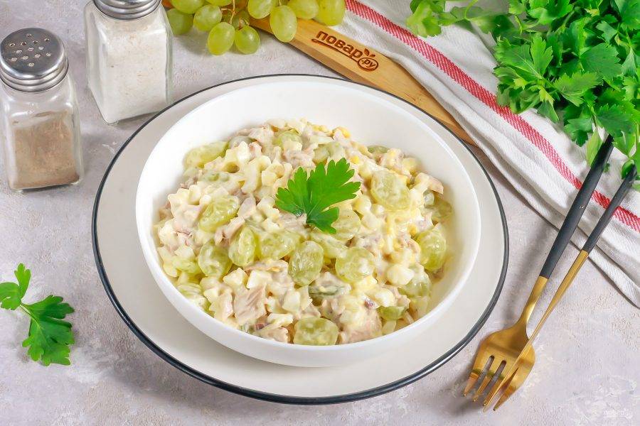 Изысканный салат с индейкой и виноградом обязательно понравится девушкам — он легок и нежен на вкус. По желанию в него можно добавить консервированный ананас или ядра грецких орехов, зеленый лук.