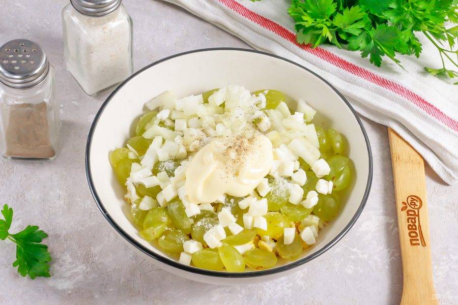 Выложите майонез любой жирности, всыпьте соль и молотый черный перец. Аккуратно все перемешайте.
