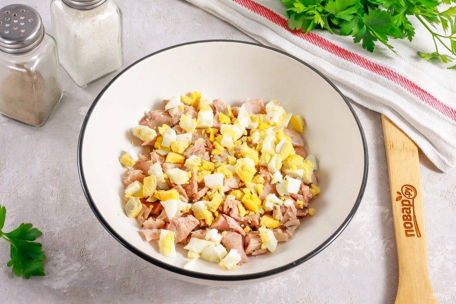 Отварное мясо индейки нарежьте мелкими или средними кубиками, высыпьте нарезку в салатник. Очистите отварное куриное яйцо от скорлупы, промойте и нарежьте такими же кубиками. По желанию можно отварить от 1 до 3 куриных яиц. Добавьте нарезку в емкость.