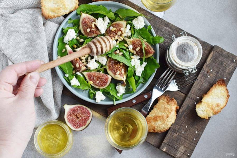 Изысканный салат с тонкой ноткой меда и бальзамического крема порадует гурманов и любителей козьего сыра и инжира. Берите на заметку рецепт!