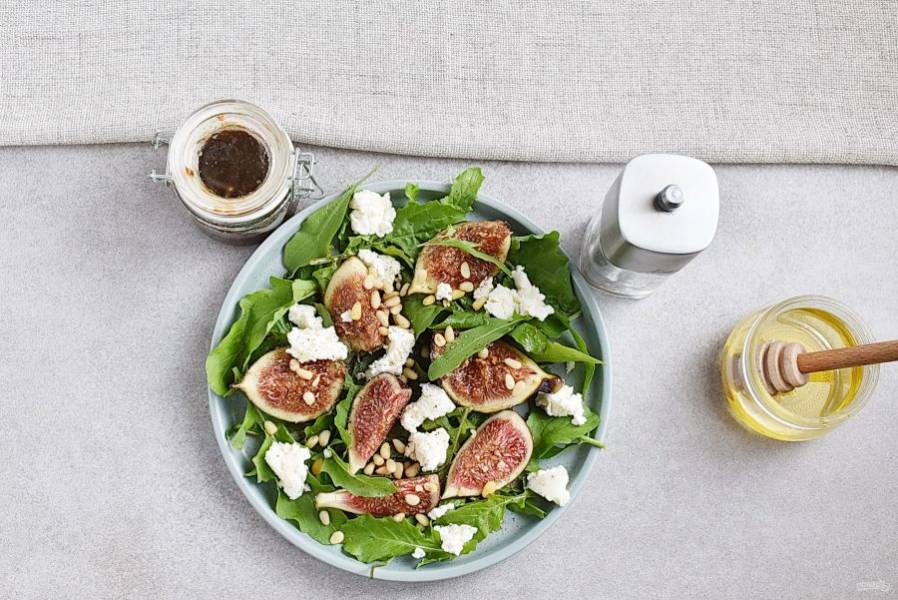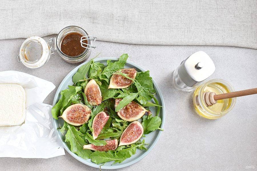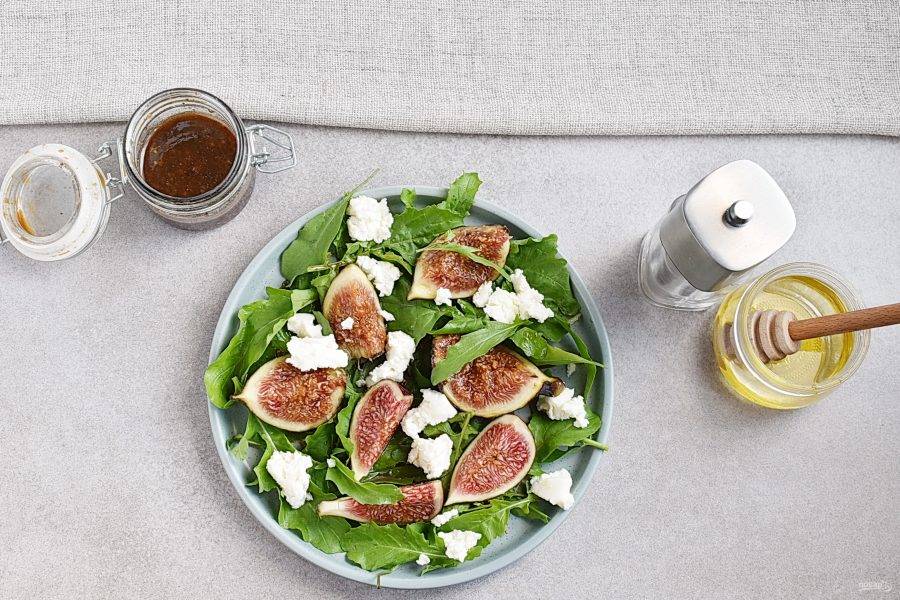Рукколу выложите на сервировочное блюдо. Сверху выложите разрезанный на дольки инжир. Полейте заправкой.