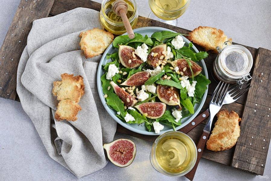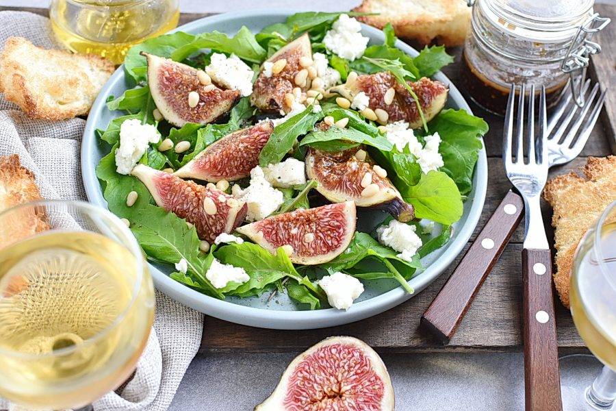 Сегодня мы приготовим салат с инжиром и рукколой — легкий вариант блюда, которое можно подать как на праздник, так и в качестве ужина. Помимо вкуса, салат получается очень нарядным.