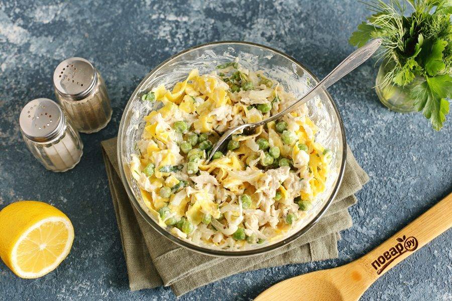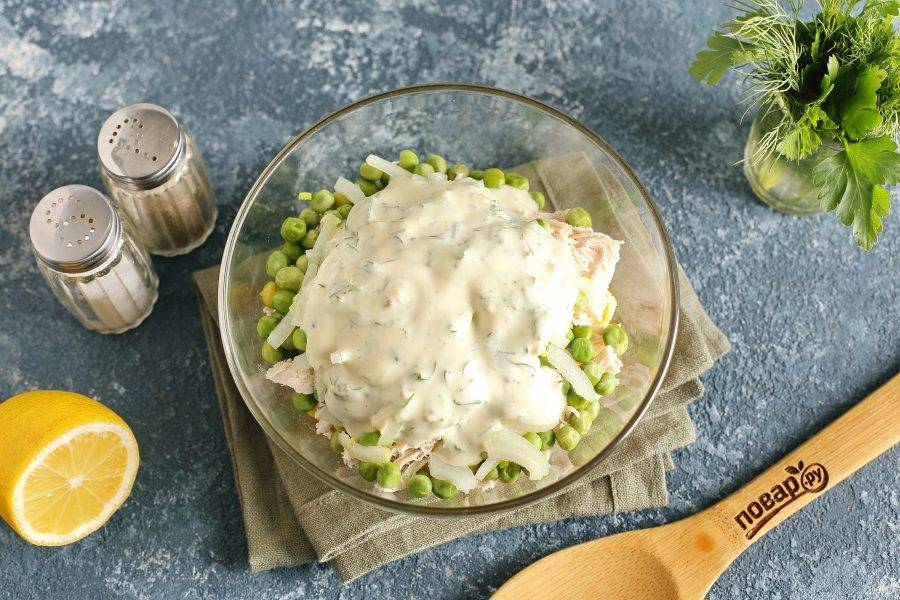 Салат посолите, поперчите по вкусу и хорошо перемешайте. Салат с йогуртовой заправкой готов.