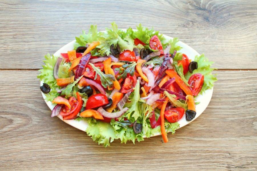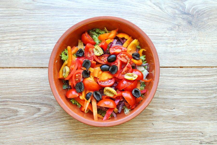 Маслины порежьте и добавьте в миску с овощами.