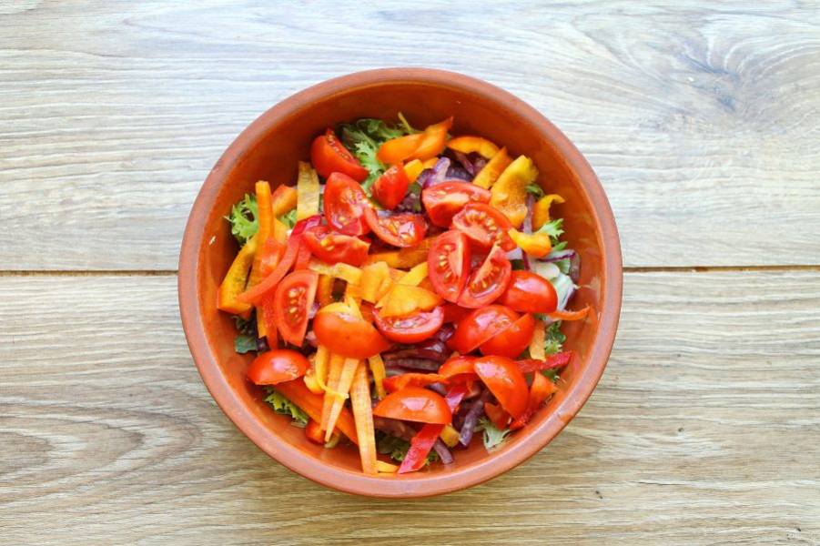 Черри порежьте на четыре части и добавьте в миску с салатом.