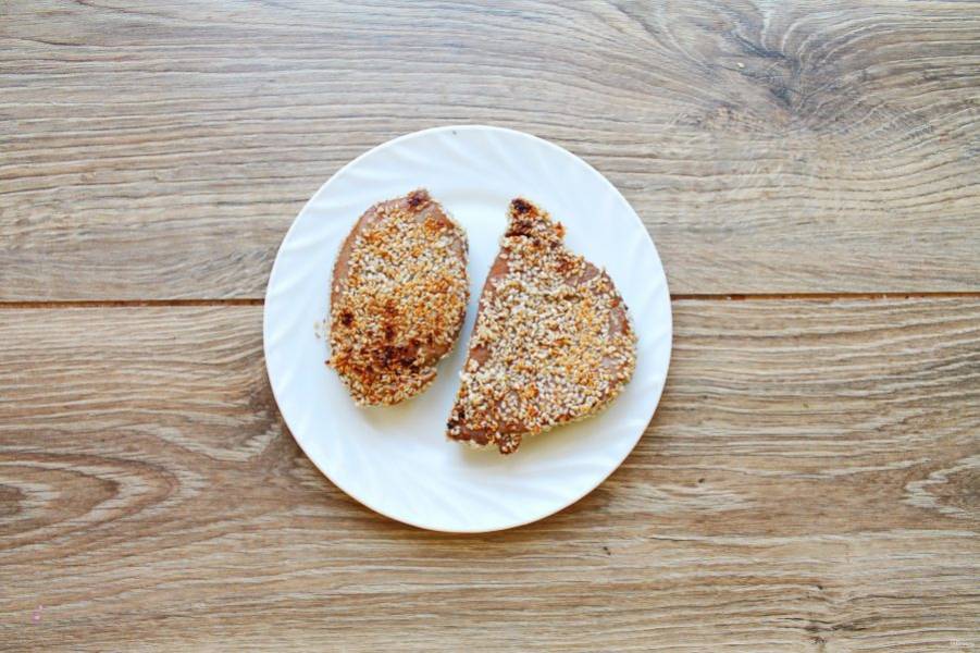 Обваляйте стейки в кунжуте и обжарьте в сухой горячей сковороде с двух сторон по 1-2 минуты, остудите.