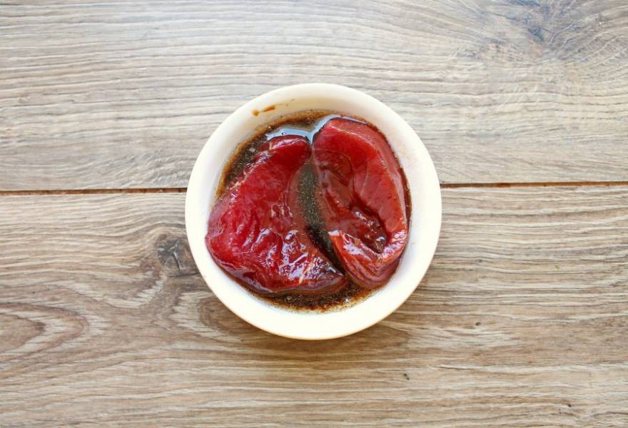 Смешайте растительное масло и соевый соус. Куски тунца обсушите бумажным полотенцем и выложите в маринад. Держите тунец по одной минуте с каждой стороны.