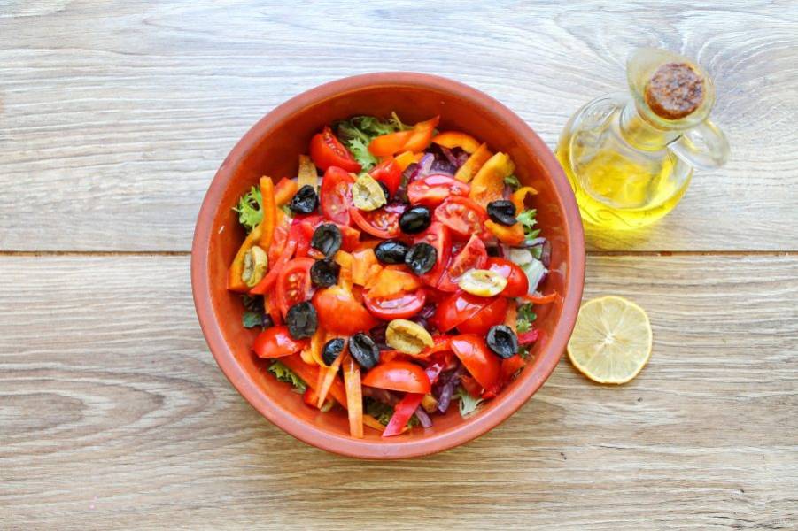Салат полейте соком лимона, посолите и перемешайте. Влейте растительное масло и перемешайте.