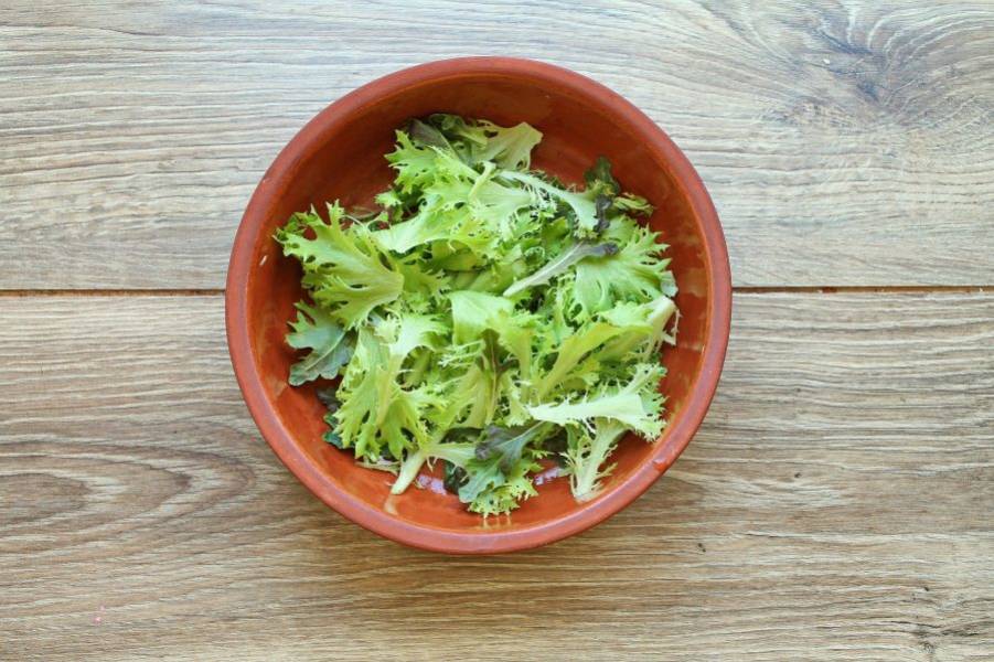 Листья салата порвите руками и выложите в миску.