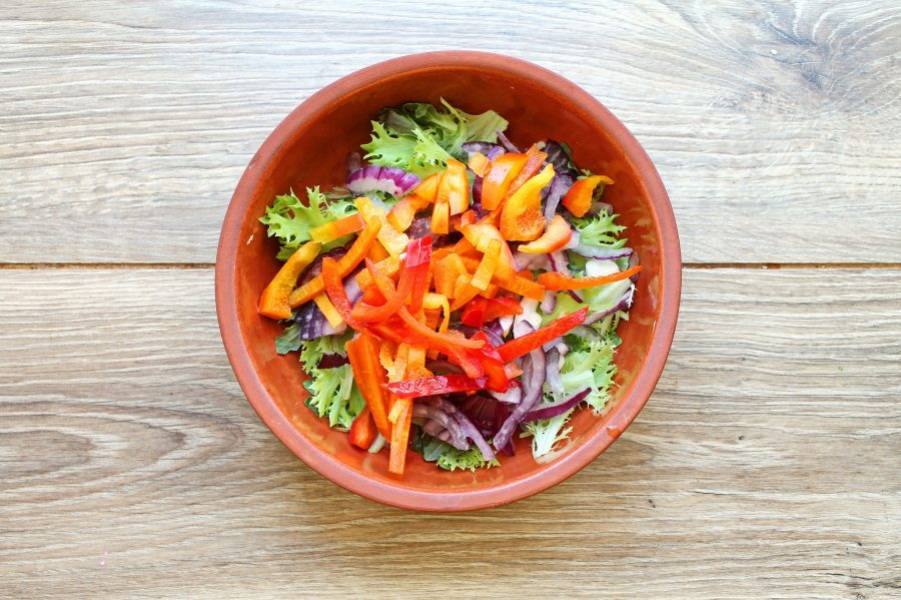 У болгарского перца отрежьте плодоножку, удалите семена и порежьте соломкой. Добавьте перец в миску с салатом и луком.