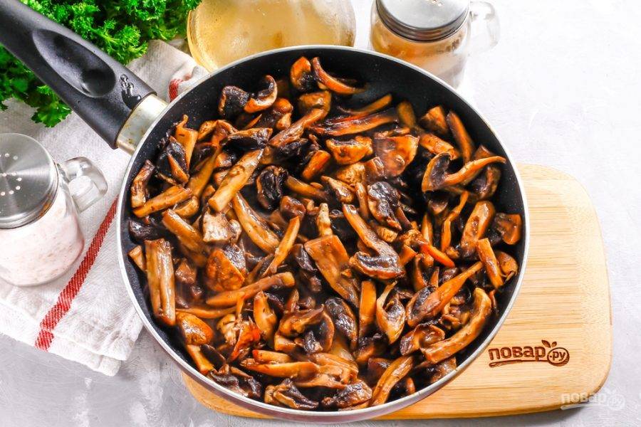 Шампиньоны промойте в воде, смывая с них грязь и землю. Нарежьте слайсами. Прогрейте на сковороде растительное масло и выложите в него грибную нарезку. Посолите и обжарьте примерно 6-8 минут. Сначала из нарезки выпарится жидкость, затем она начнет подрумяниваться. Главное - не забывайте ее помешивать, чтобы грибы равномерно прожарились до золотистой корочки.