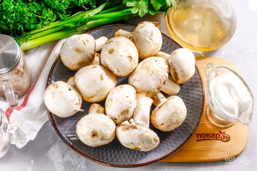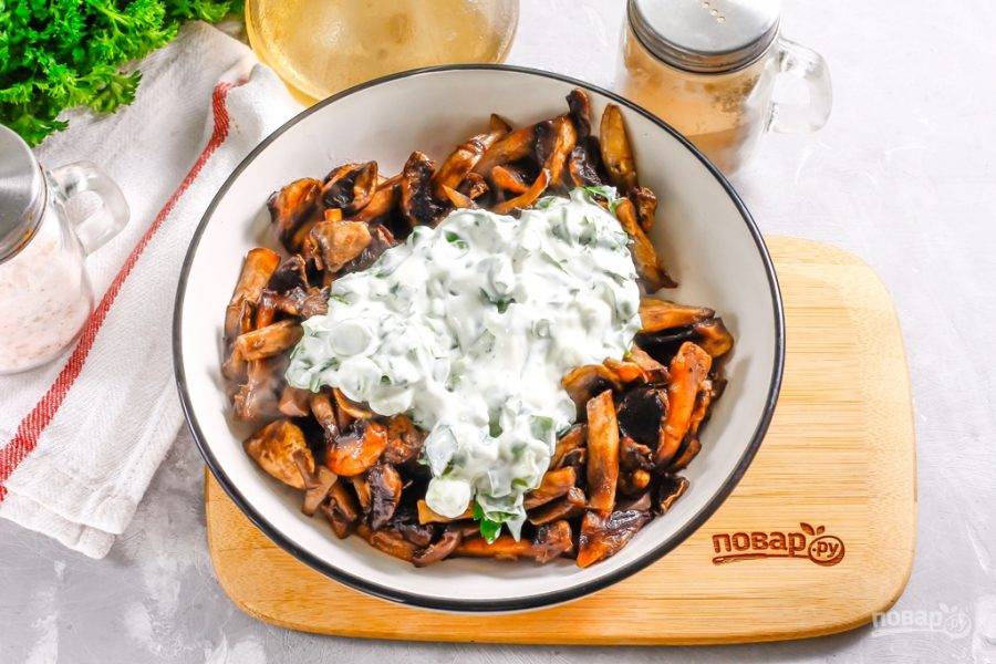 К этому времени как раз обжарятся грибы. Выключите нагрев и остудите их на холоде примерно 15-20 минут, так как если смешать горячие ингредиенты со сметаной, то срок годности салата будет всего лишь 1-2 часа.