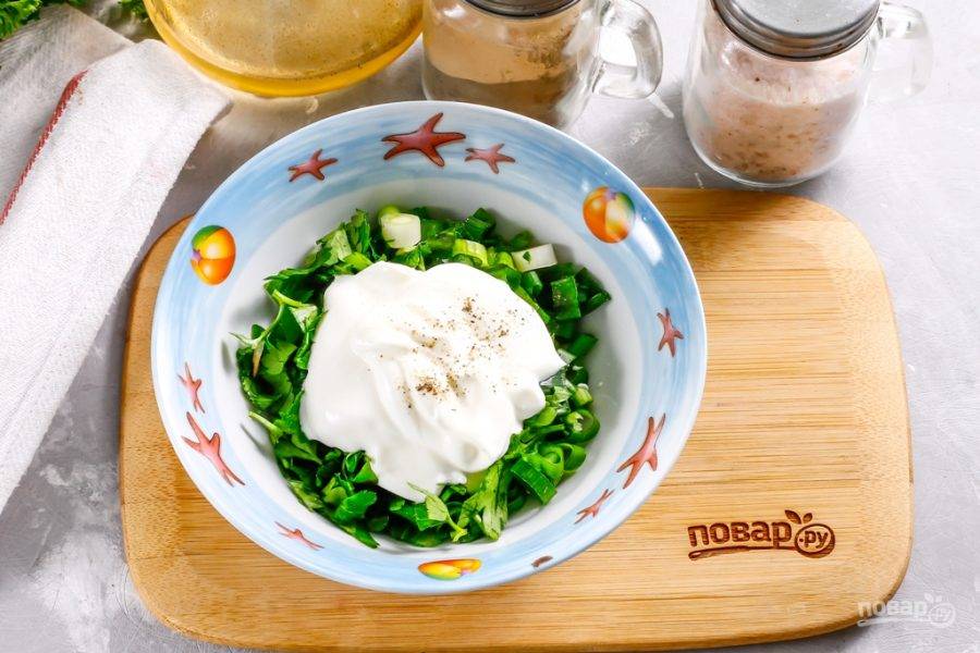 Добавьте в емкость к измельченной зелени сметану любой жирности, соль и молотый черный перец. По желанию влейте немного оливкового масла и лимонного сока, аккуратно все перемешайте.