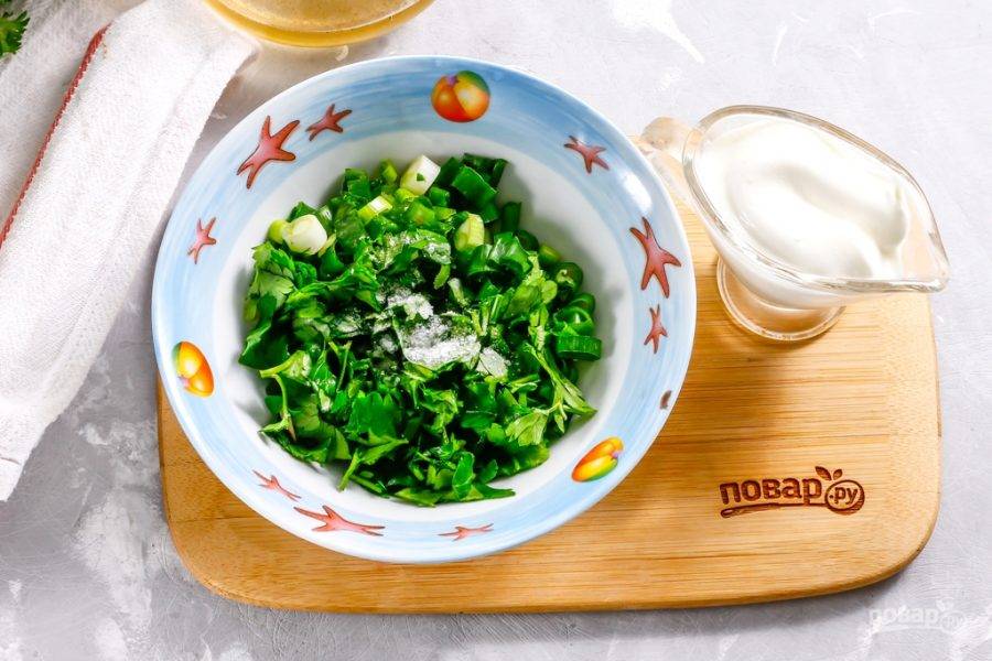 Промойте свежую зелень, срежьте с зеленого лука корешки, с петрушки - стебли. Измельчите и выложите в глубокую емкость.