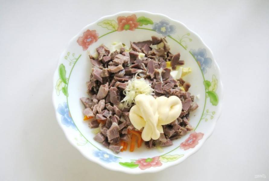 Вареные желудки индейки мелко нарежьте, отправьте в салатник.