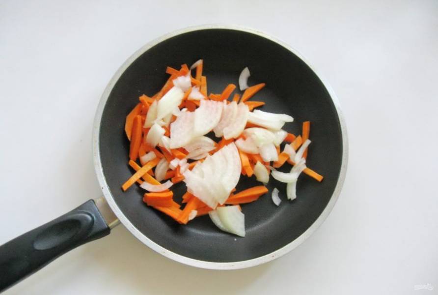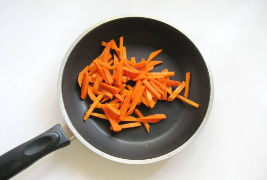 Морковь очистите и нарежьте соломкой. Выложите в сковороду.